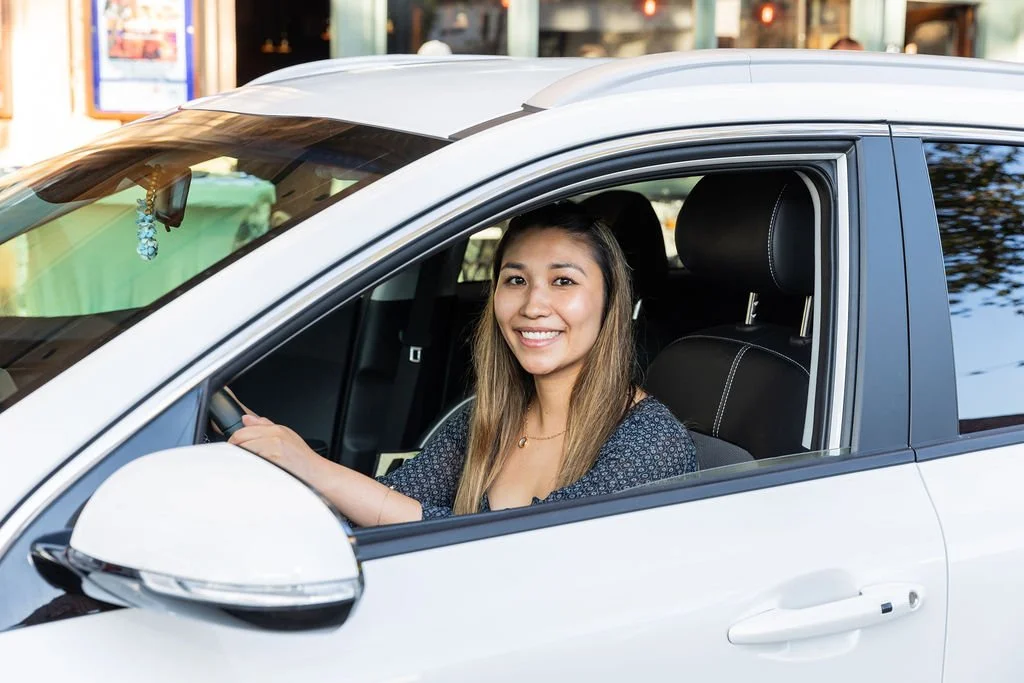 Sachi Shiroma behind the wheel of her Kia Niro Ex at CEC’s 2025 EV Incentives Resource Fair in Santa Barbara.
